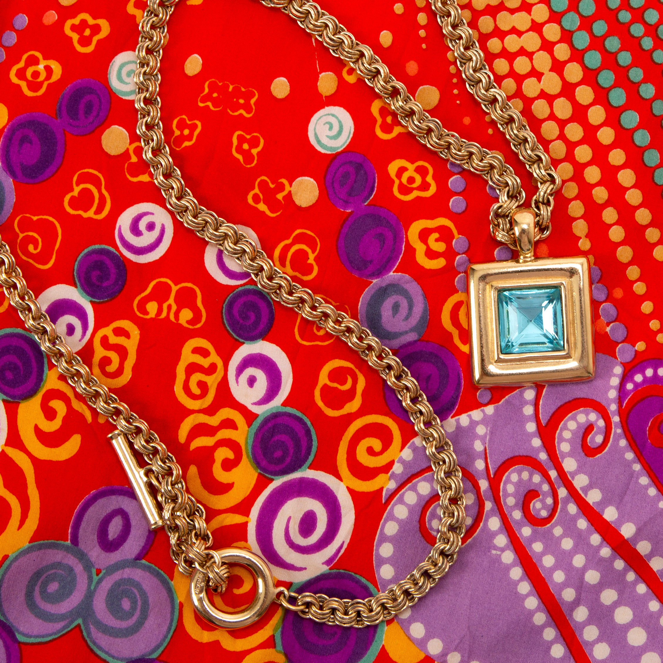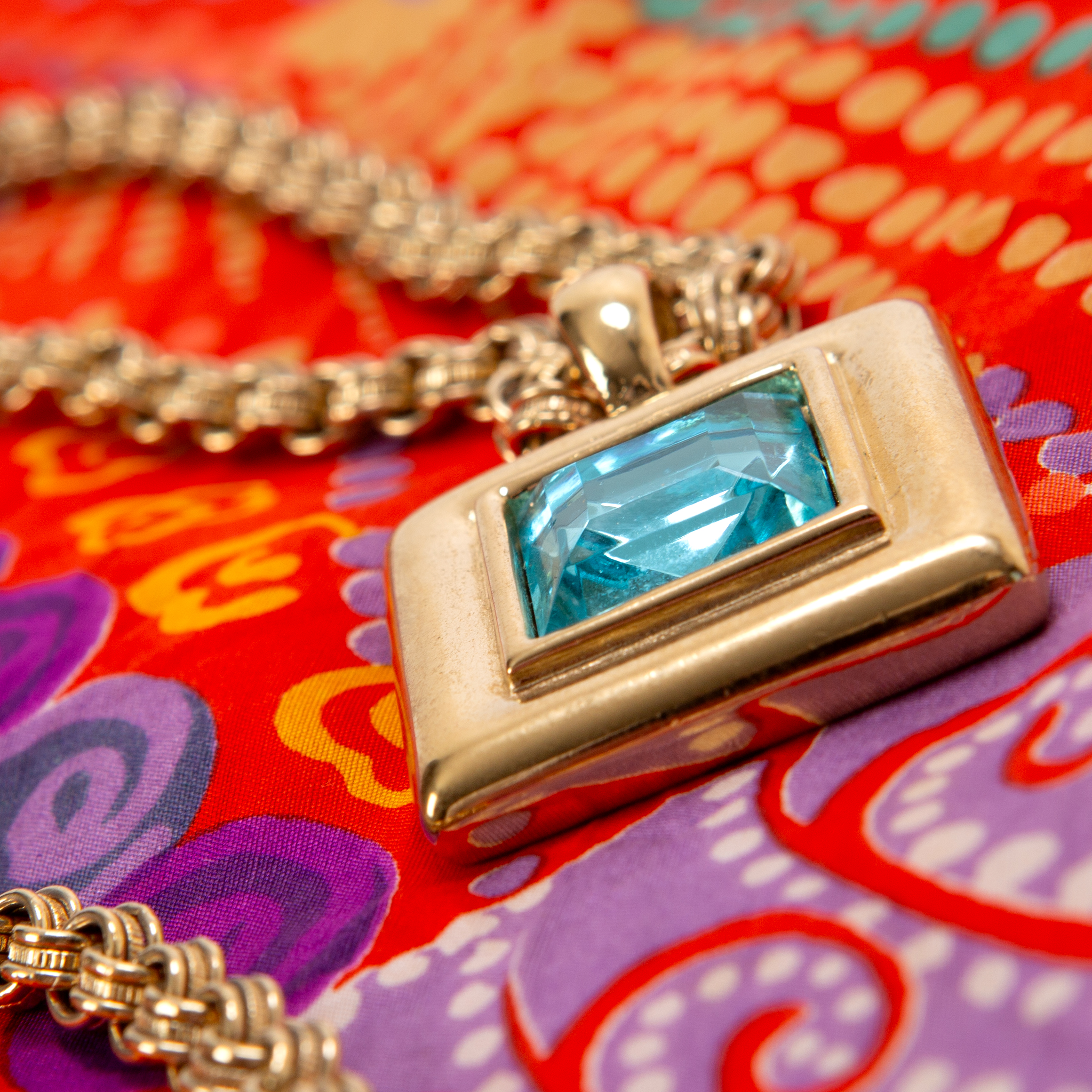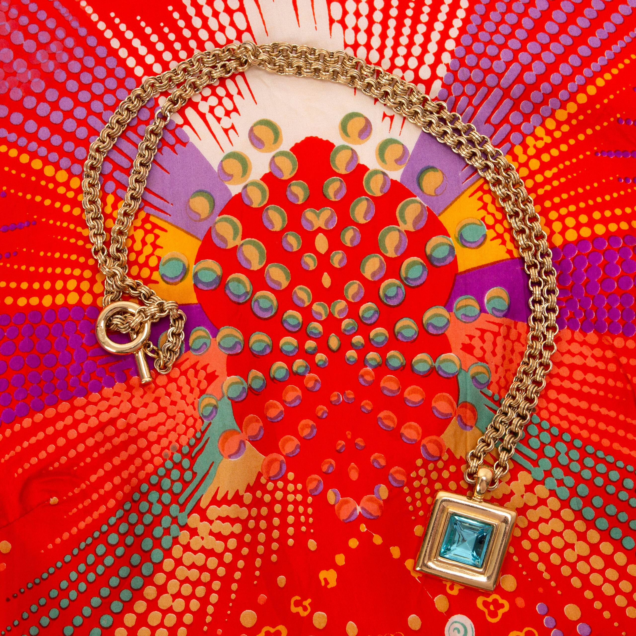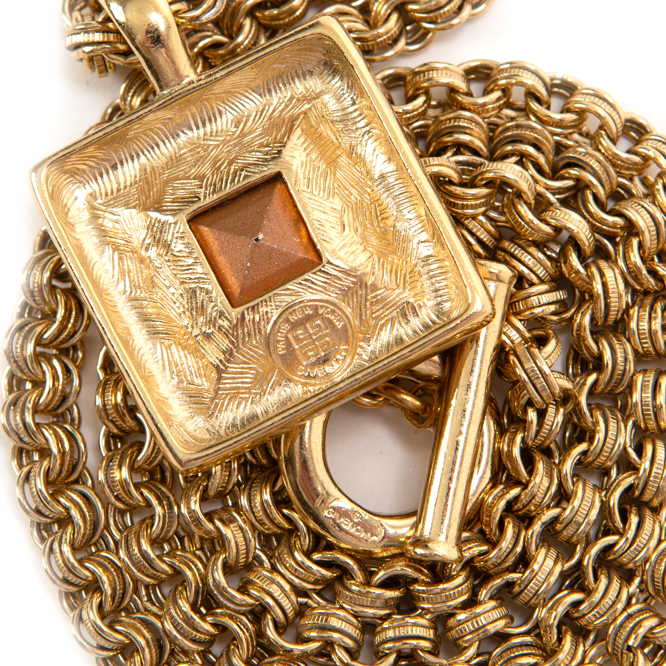 Vintage featuring a square pendant with a centered blue glass chrystal. The Givenchy trademark at the back of the pendant and closure.