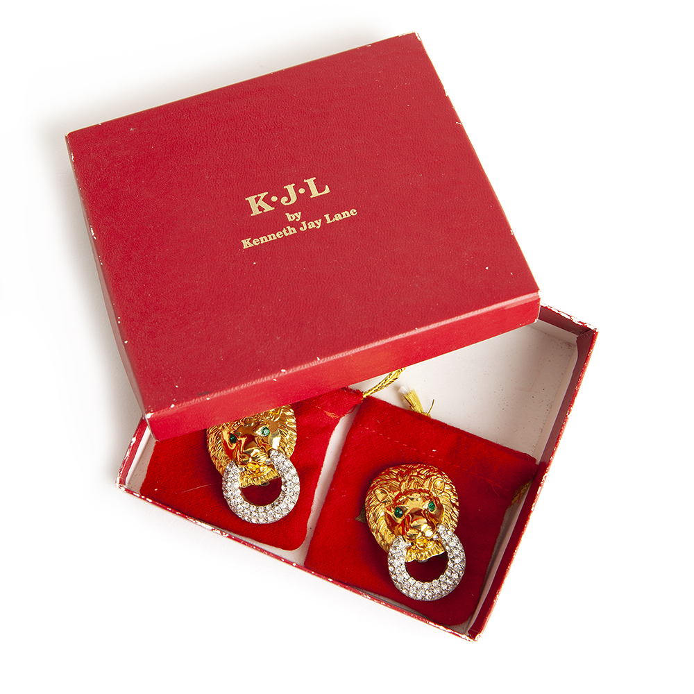 Vintage and Authentic Kenneth Jay Lane lion gold – plated earrings.