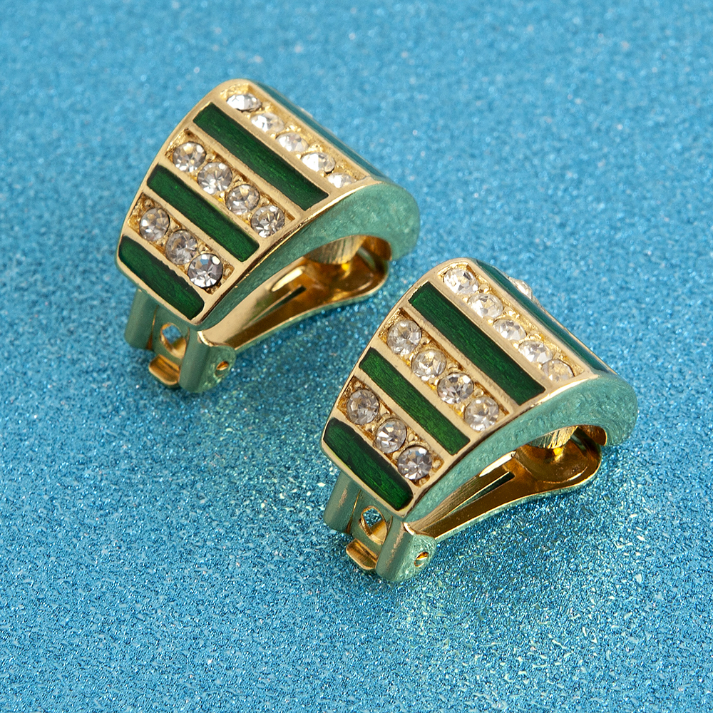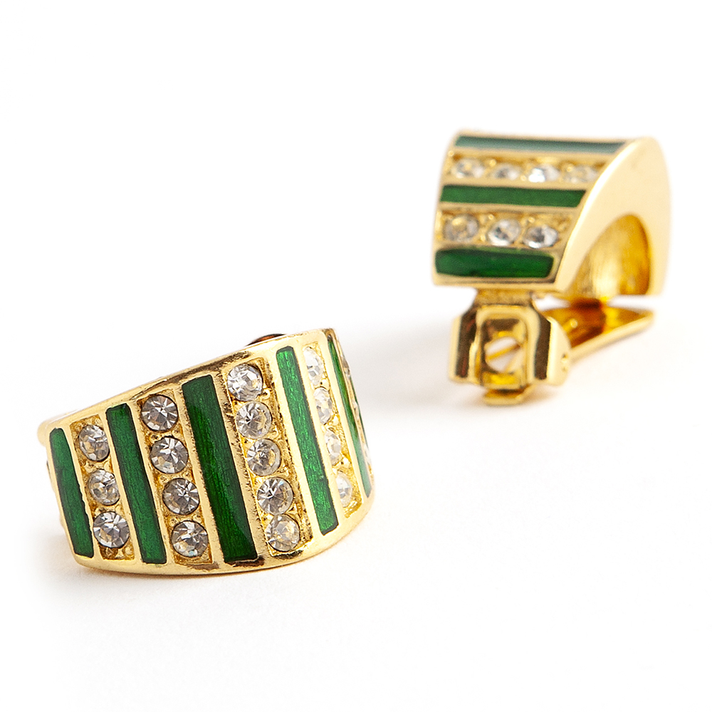 Featuring crystals in gold tone brass with emerald green enamel details in between.