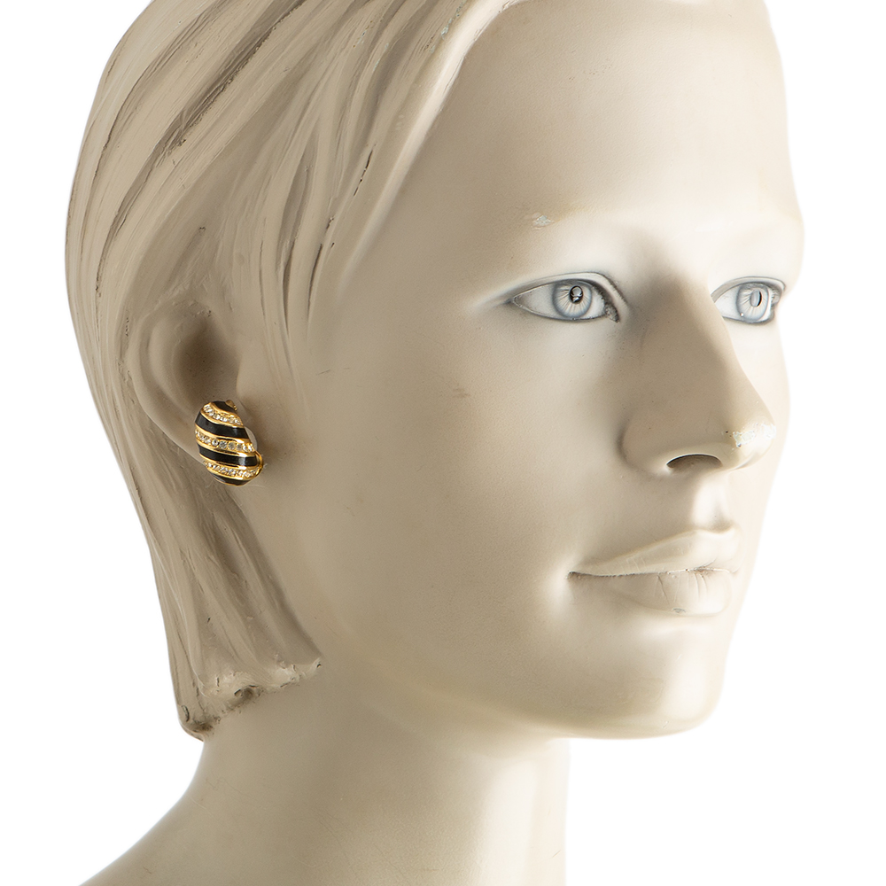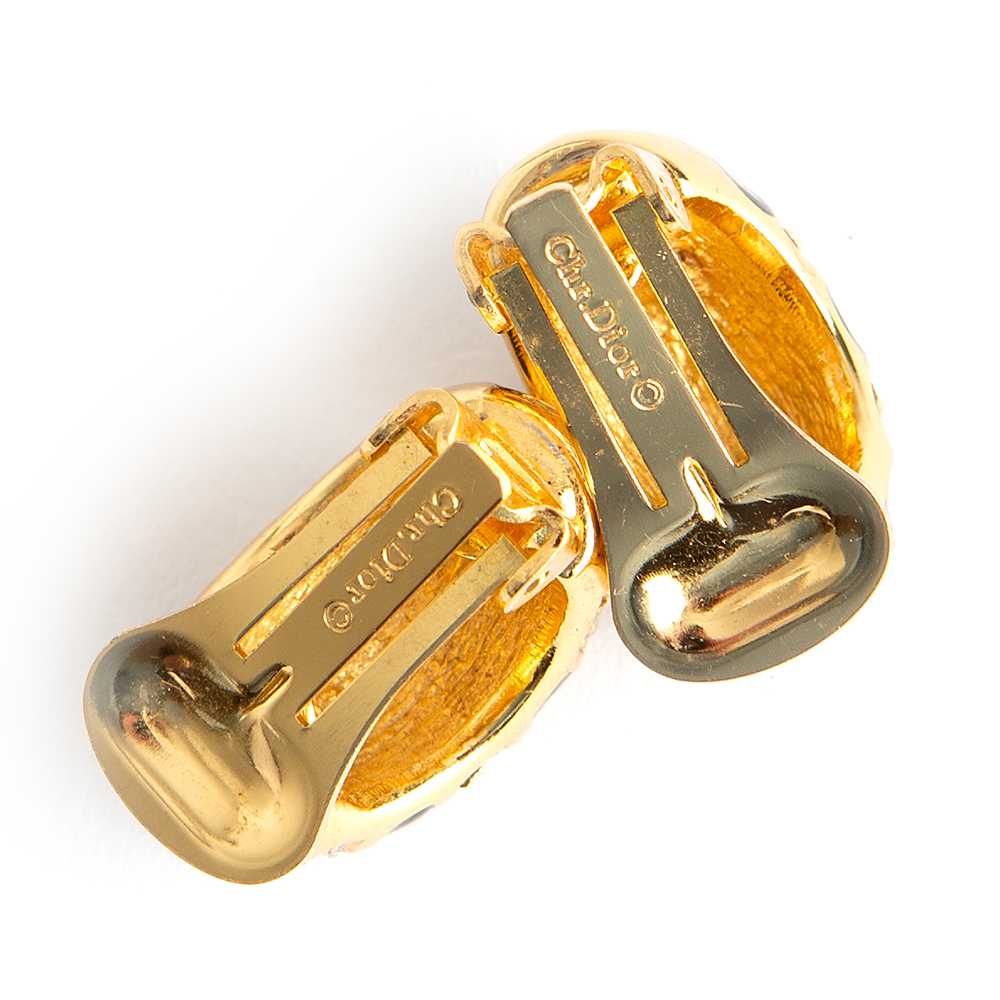 Gold-tone clip-on earrings from Christian Dior Vintage. Featuring chrystal glass stones combined in black enamel and gold tone metal color.