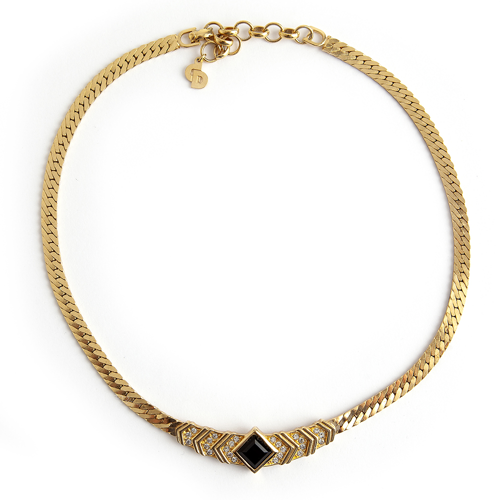 Vintage spectacular gold-tone metal chain choker from Christian Dior 1980’s – 1990’s. Vintage featuring a triangle in black enamal and chrystal rhinestone and the Dior trademark at CD detail hanging from closure which is strong/tight & secure.
