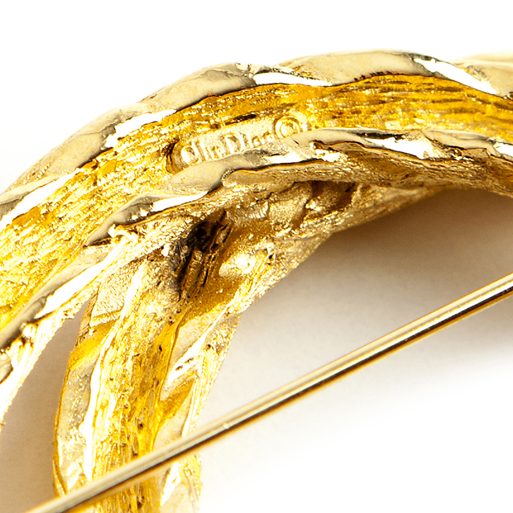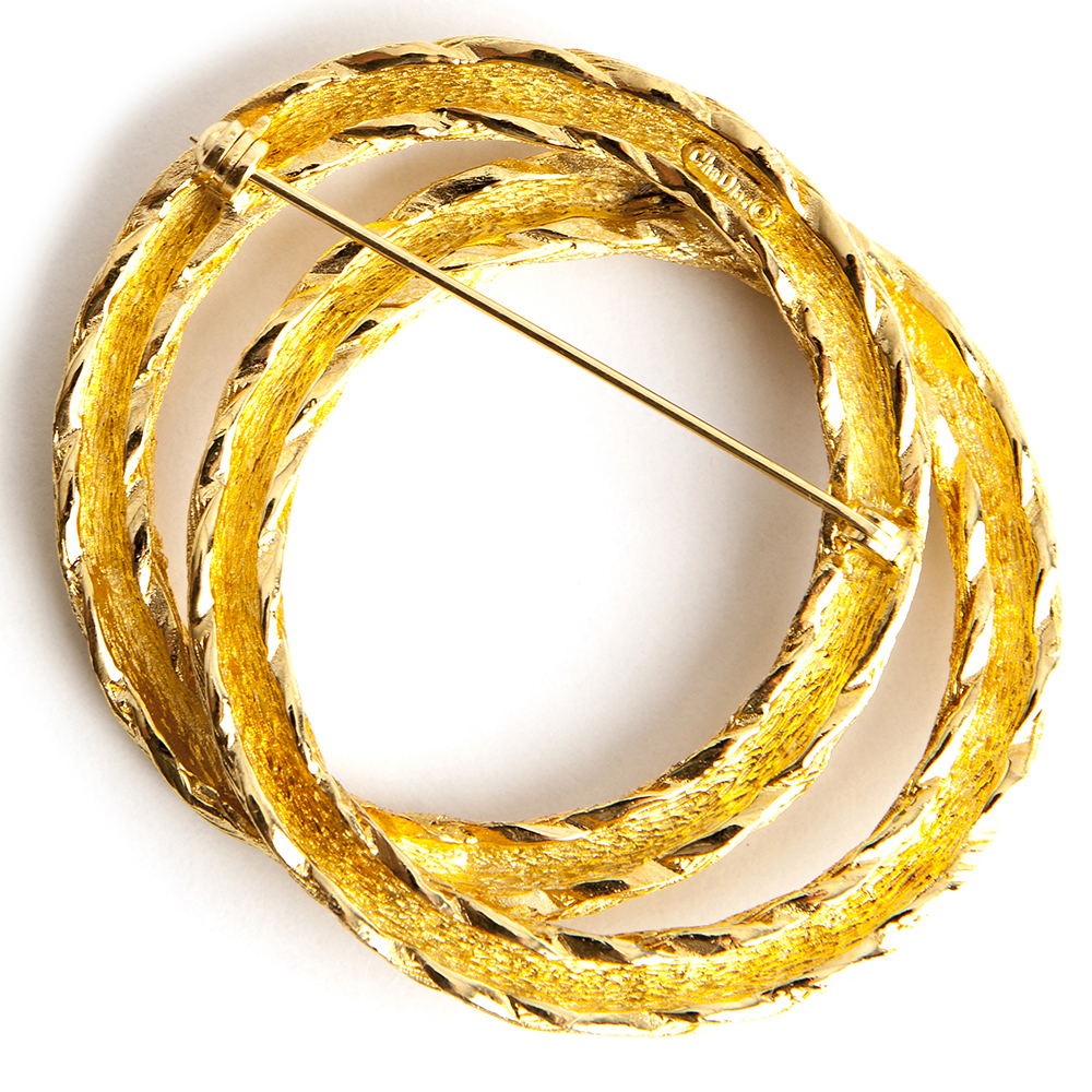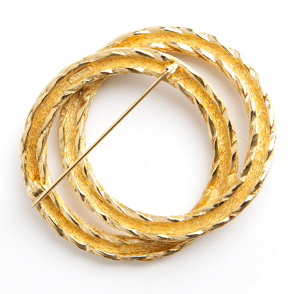 A refined addition to any ensemble, this gold plated brass 1980’s – 1990’s – vintage 2 round brooch from Christian Dior features a textured twist. In very good condition, minor vintage traces. Pin works properly.