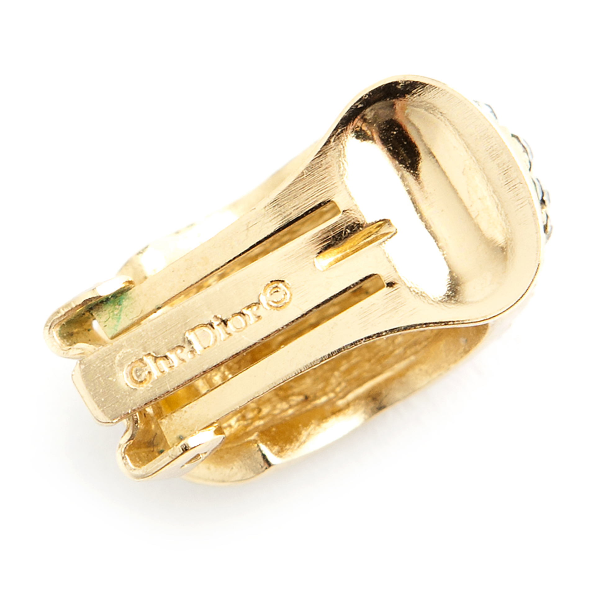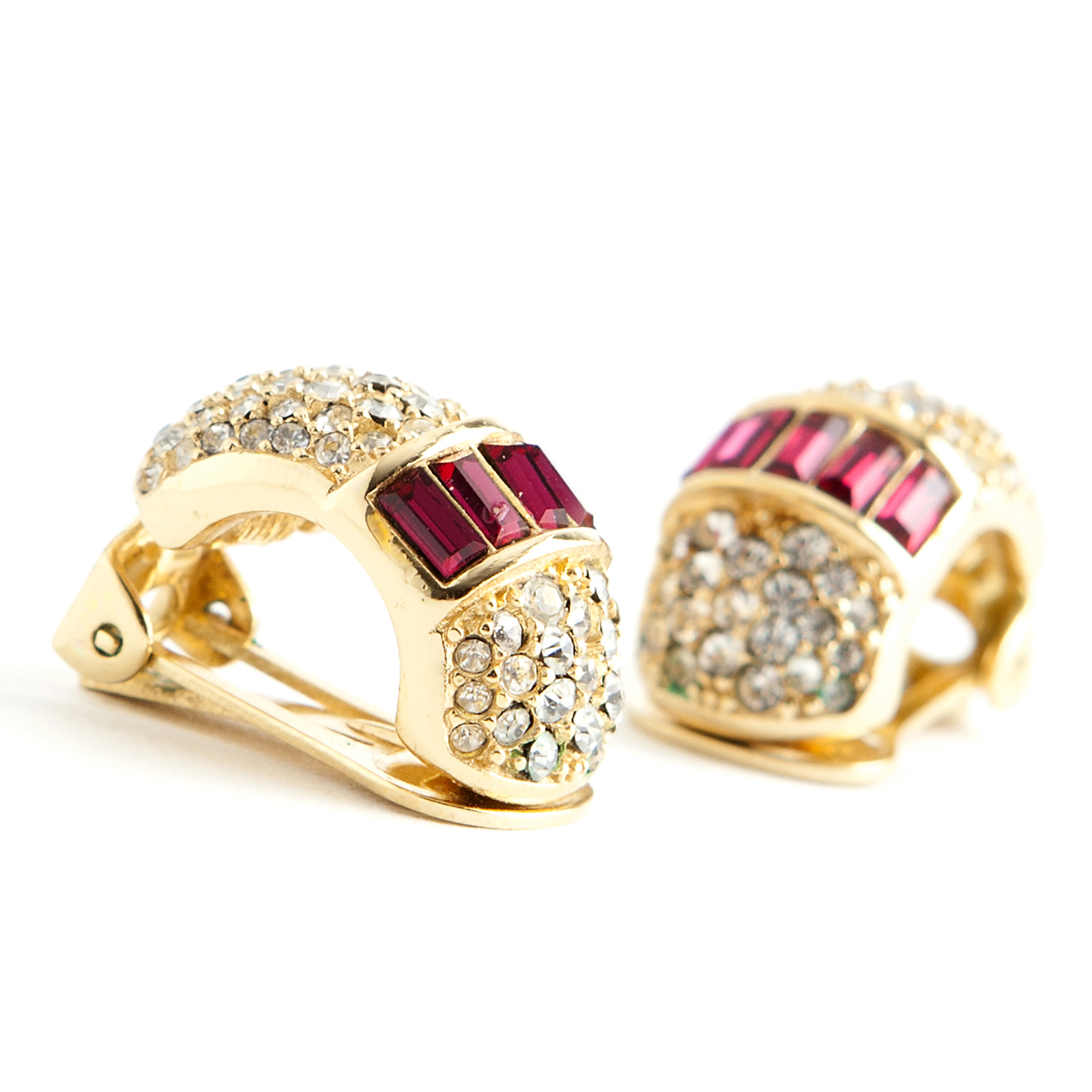 Gold-tone clip-on earrings from Christian Dior Vintage. Featuring crystal glass stones with ruby red crystal glass stones in art deco style lines.