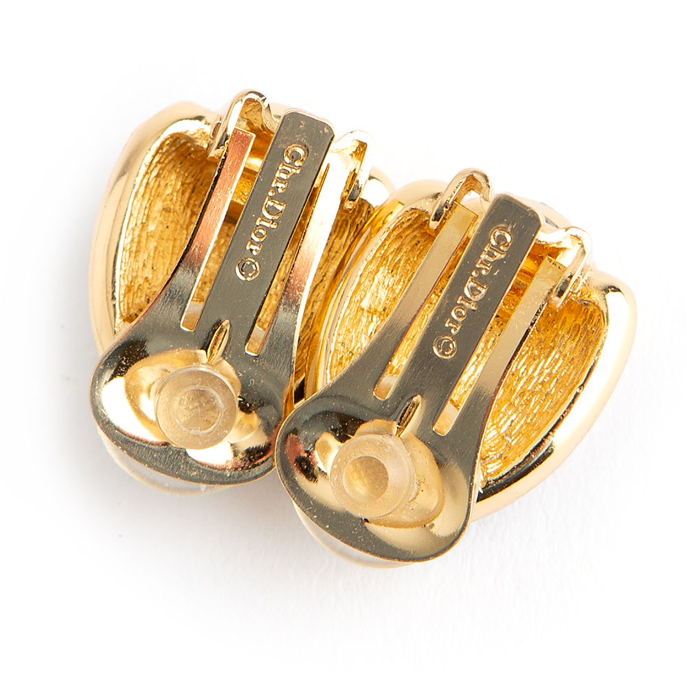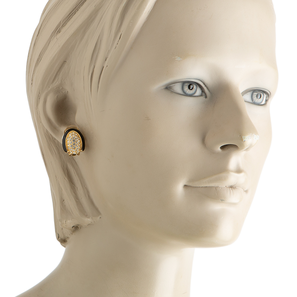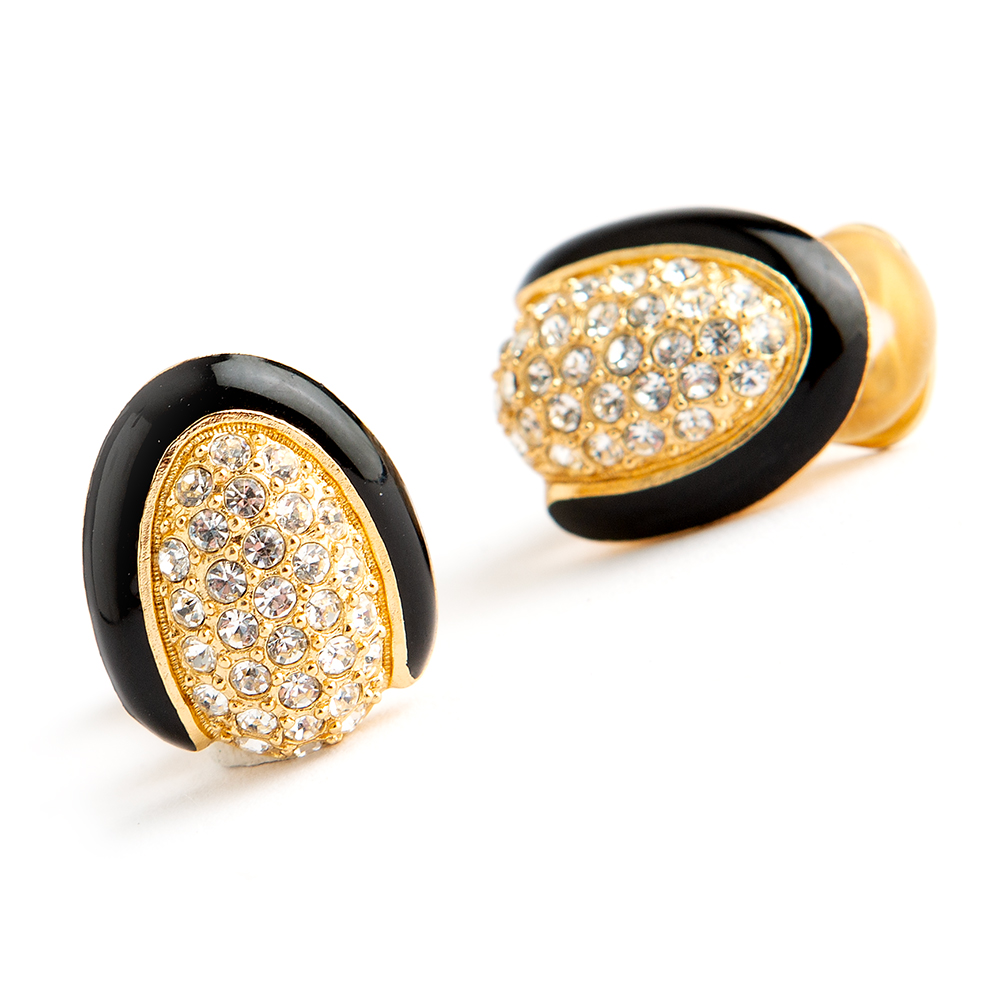 Gold-tone clip-on earrings from Christian Dior Vintage. Featuring chrystal glass stones combined in black enamel and gold tone metal color.