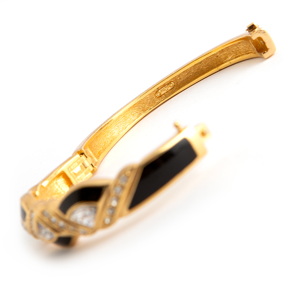 An exquisite design with pave bright Chrystal glass stones with the gold tone metal is bright and vibrant and this beauty will light up any outfit! A gorgeous vintage piece!