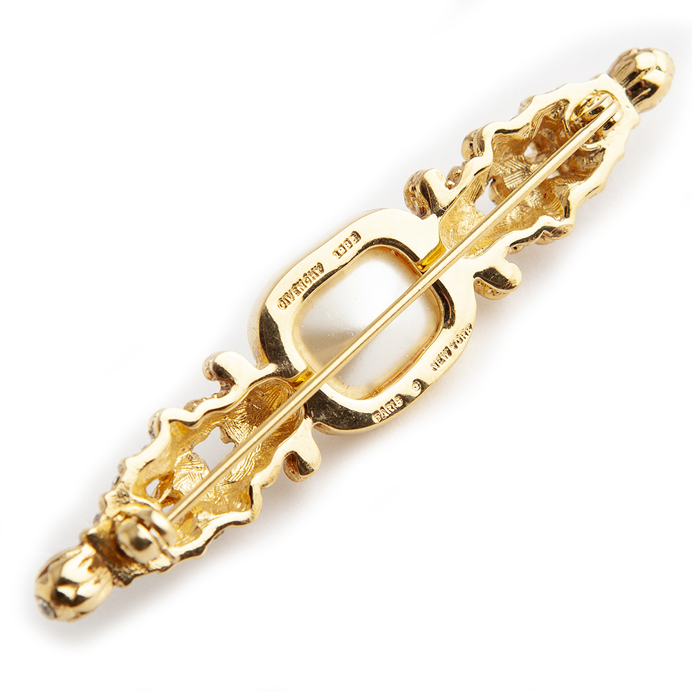 A refined addition to any ensemble, this Gold Plated brass 1980’s Vintage brooch from Christian Dior Vintage features a faux pearl with chrystal stones. Signed Christian Dior.