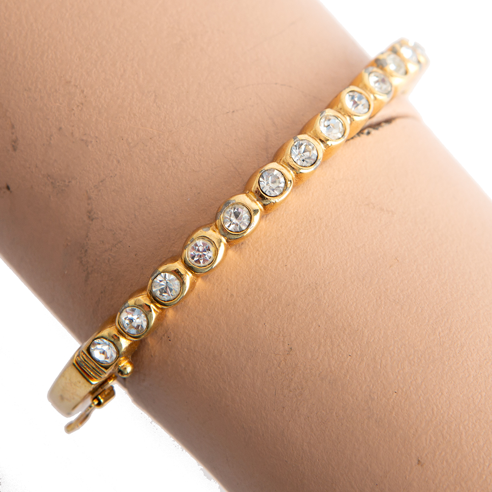 One size, bracelet closes with click construction which is in perfect working order. All chrystal stones are intact.