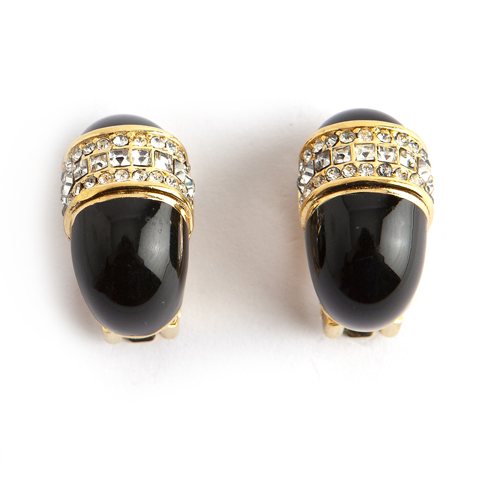 Gold-tone clip-on earrings from Christian Dior vintage. Featuring a rectangle shape combined with black enemal and crystals stones in gold color.