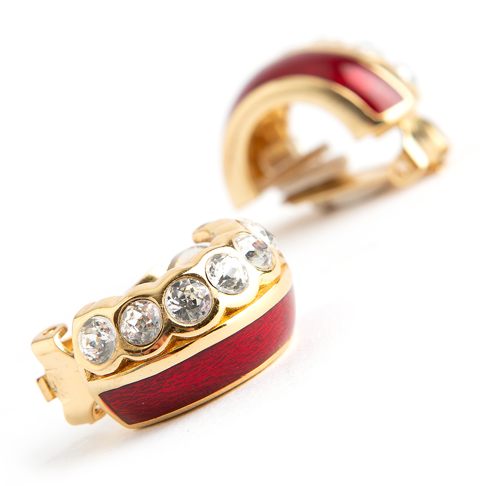 Gold-tone clip-on earrings from Christian Dior Vintage. Featuring chrystal glass stones with ruby red enemal in art deco style lines.