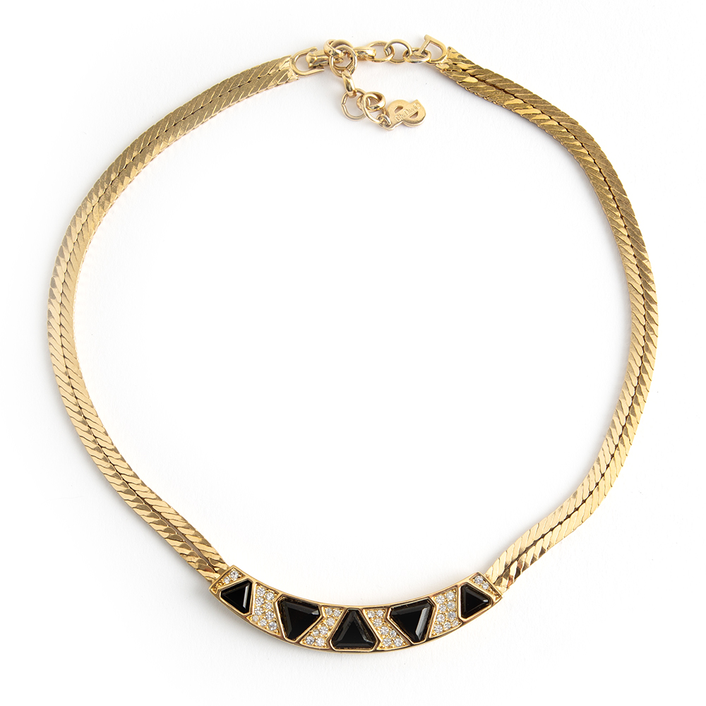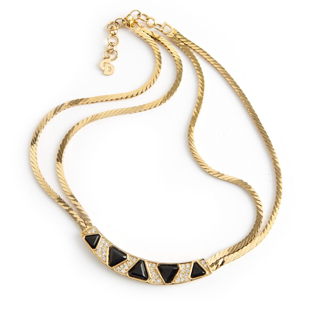 Signed Christian Dior, gorgeous gold plated necklace, with black enamal paste surrounded by clear chrystal stones.This is a classic Christian Dior necklace from the 1980’s – 1990’s which features a shiny gold tone double chain attached to a bright chrystal and black paste pendant which truly give the illusion of precious jewel.