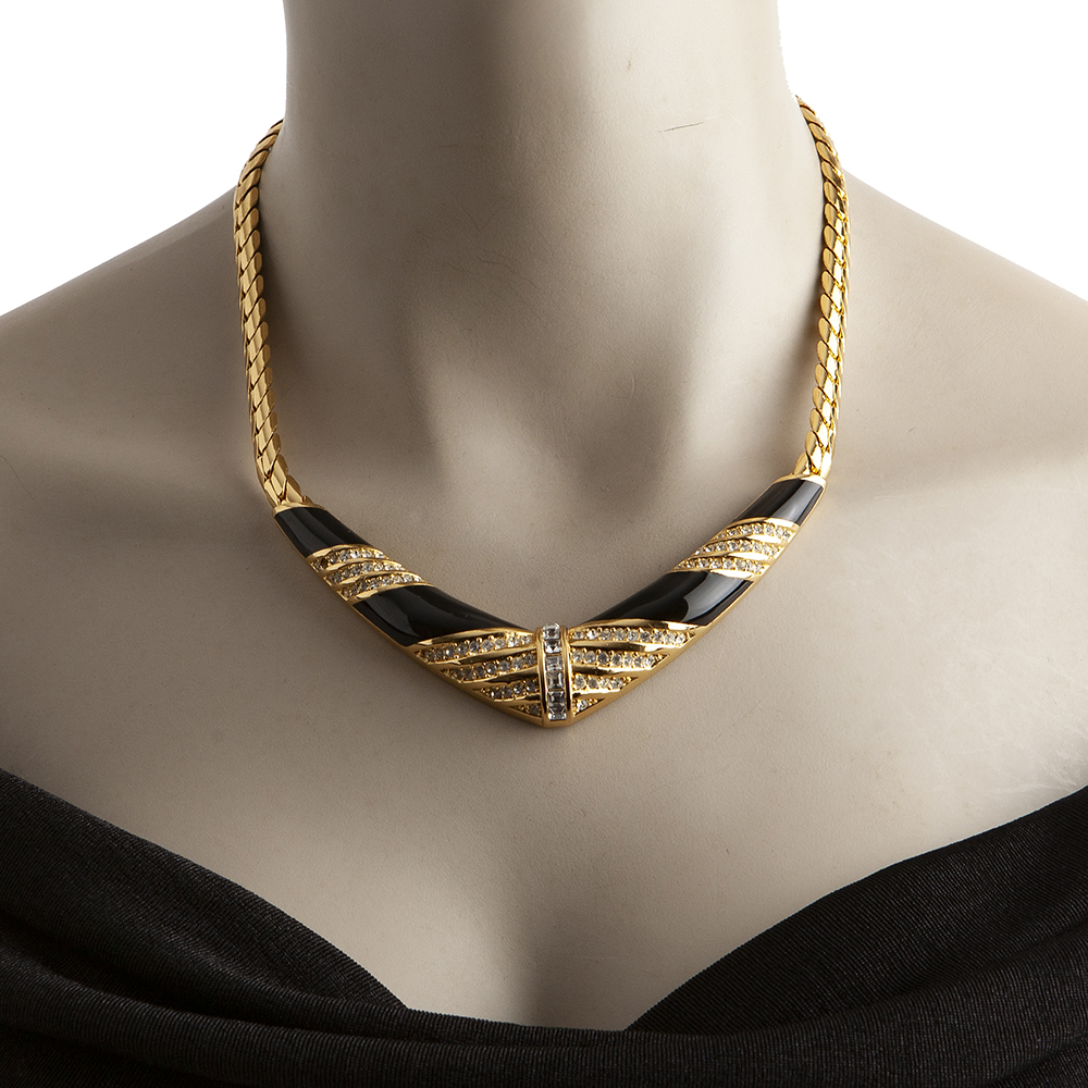 | Signed Christian Dior, gorgeous gold plated necklace, with black enamel paste surrounded by clear chrystal stones. This is a classic Christian Dior necklace from the 1980’s – 1990’s which features a shiny gold tone snake chain attached to a bright chrystal and Black paste pendant which truly give the illusion of precious jewel.
