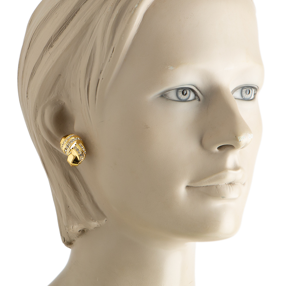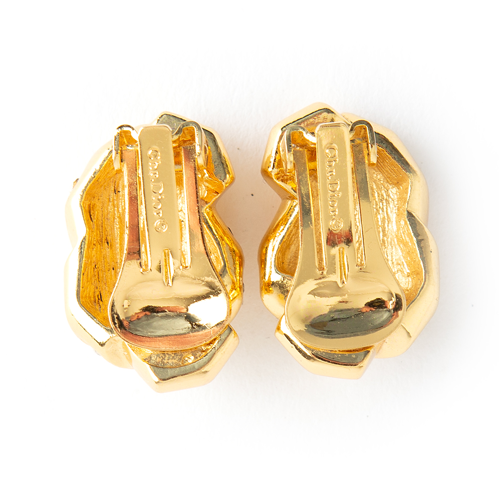 A refined addition to any ensemble, this gold plated brass 1980’s – 1990’s vintage rounded swirl clip on earings from Christian Dior Vintage features a textured twist with chrystal glass stones.