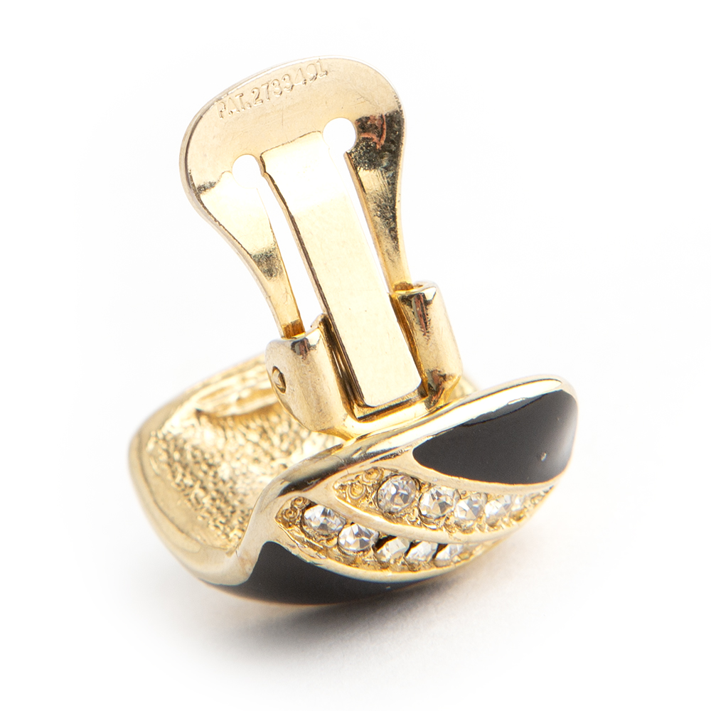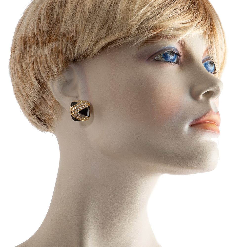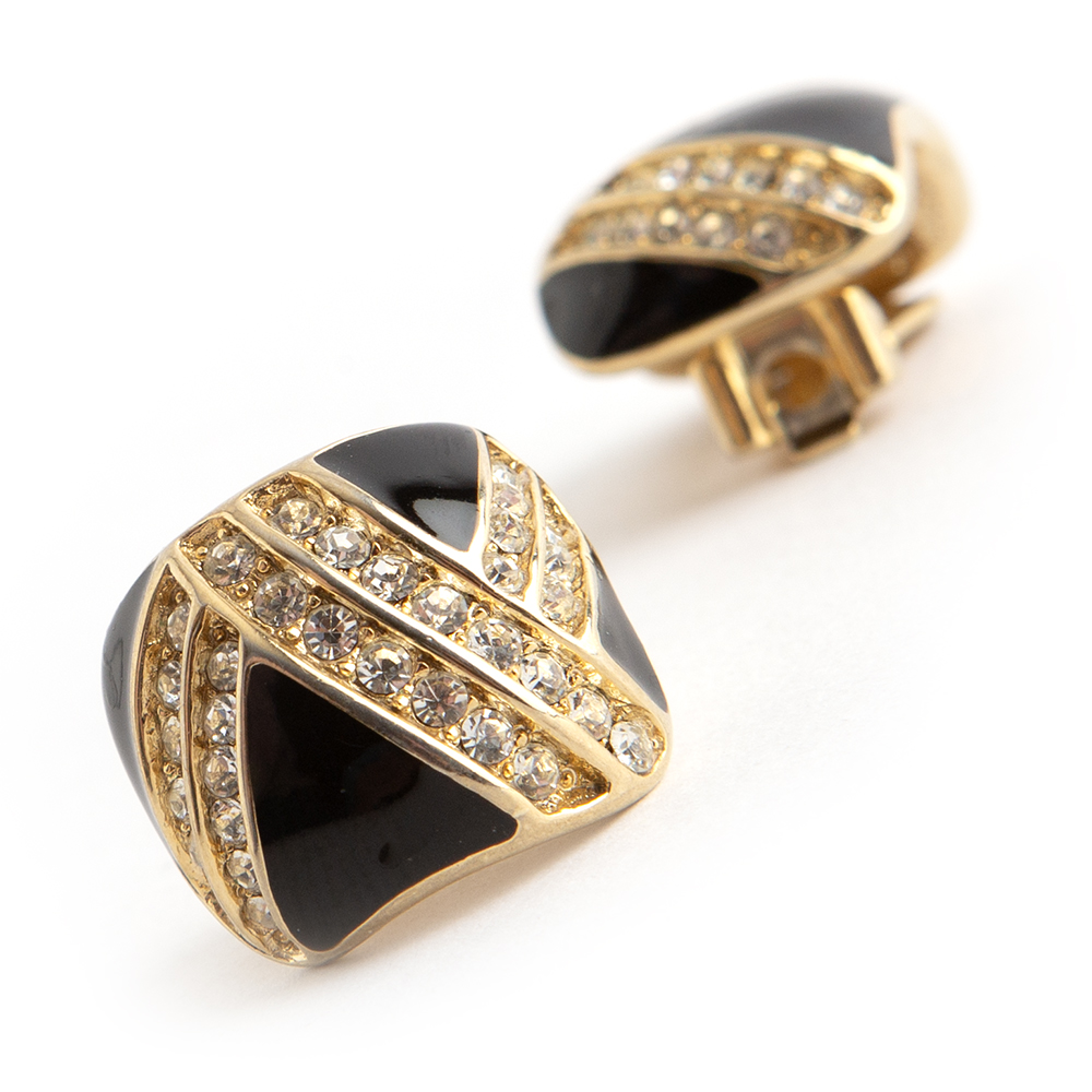 Gold-tone clip-on earrings from Christian Dior vintage. Featuring a square shape combined with black enamel and crystals stones in gold color.