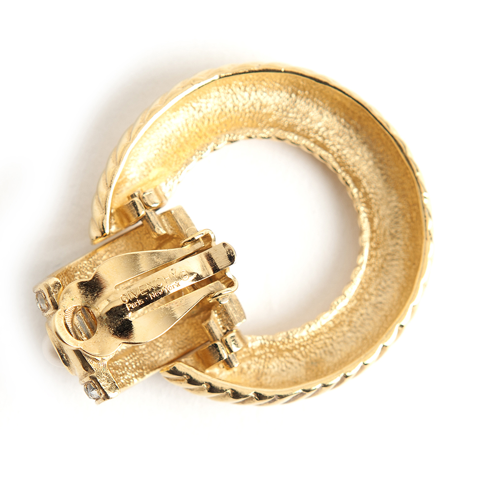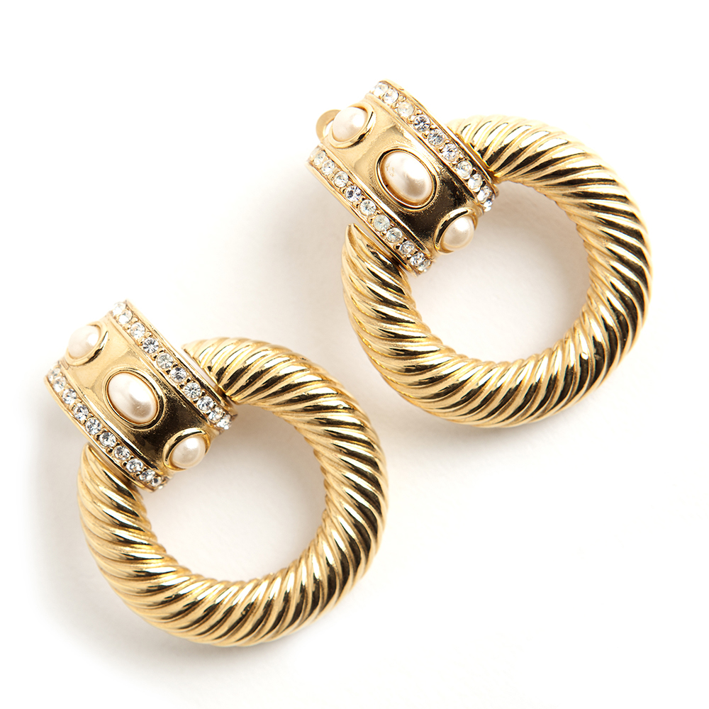 These fabulous gold plated brass 1980s clip-on door knocker earrings from Givenchy – Vintage are featured with rhinestones and pearls. Signed Givenchy. Clips are secure with excellent tension.