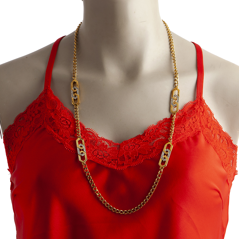 Givenchy!! The name is synonymous with haute couture and understated elegance and this necklace is a testament to the brand and style. The necklace is the perfect length for wearing with a T-shirt, turtle neck, V-shape jumper, blouse or to liven a plain sheath dress in both wearing double or single. This necklace is in excellent pre-owned condition, the gold finish is uniform and bright.