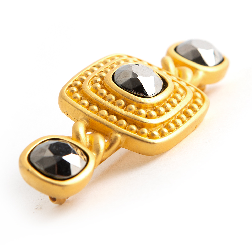 Fit for any vintage jewelry lover, this amazing chic brooch features a royal design in gold tone with oily chrystals.