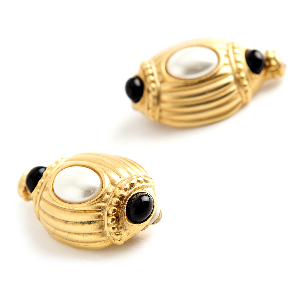 These Gold Plated Brass 1980’s – 1990’s clip-on earrings from Givenchy Vintage featuring black gems and are centered with a faux pearl. Signed Givenchy.