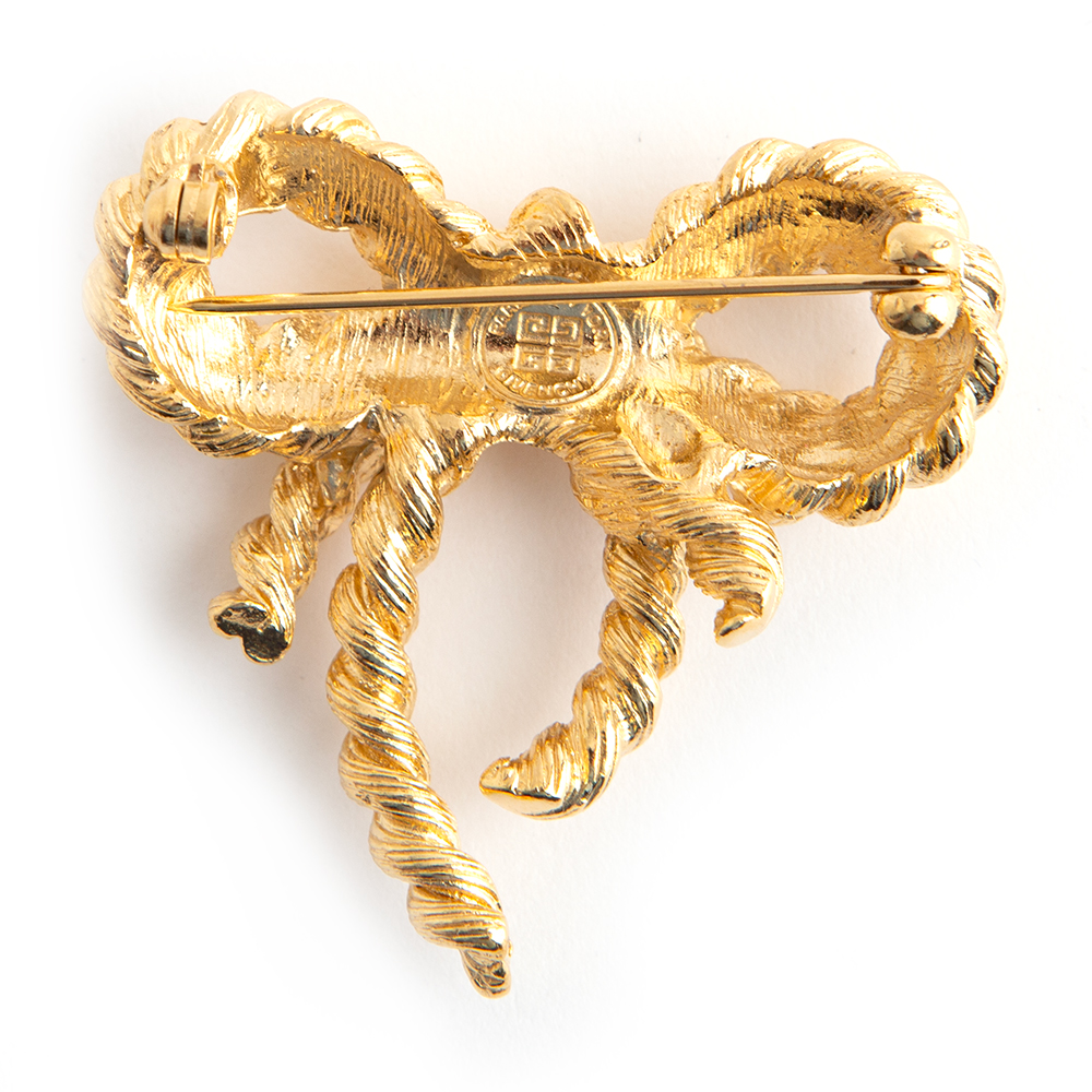 Gold tone plated bow pin by vintage Givenchy. Authenticity mark branded in the back of the pin.