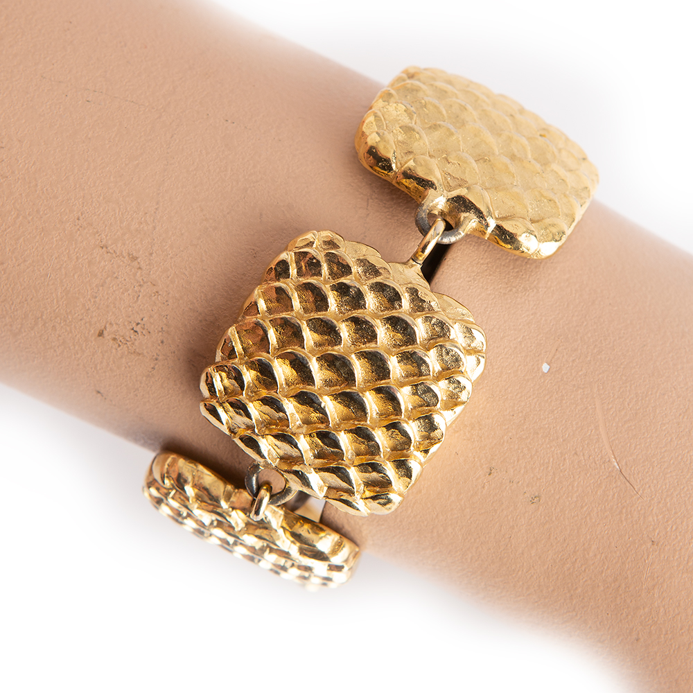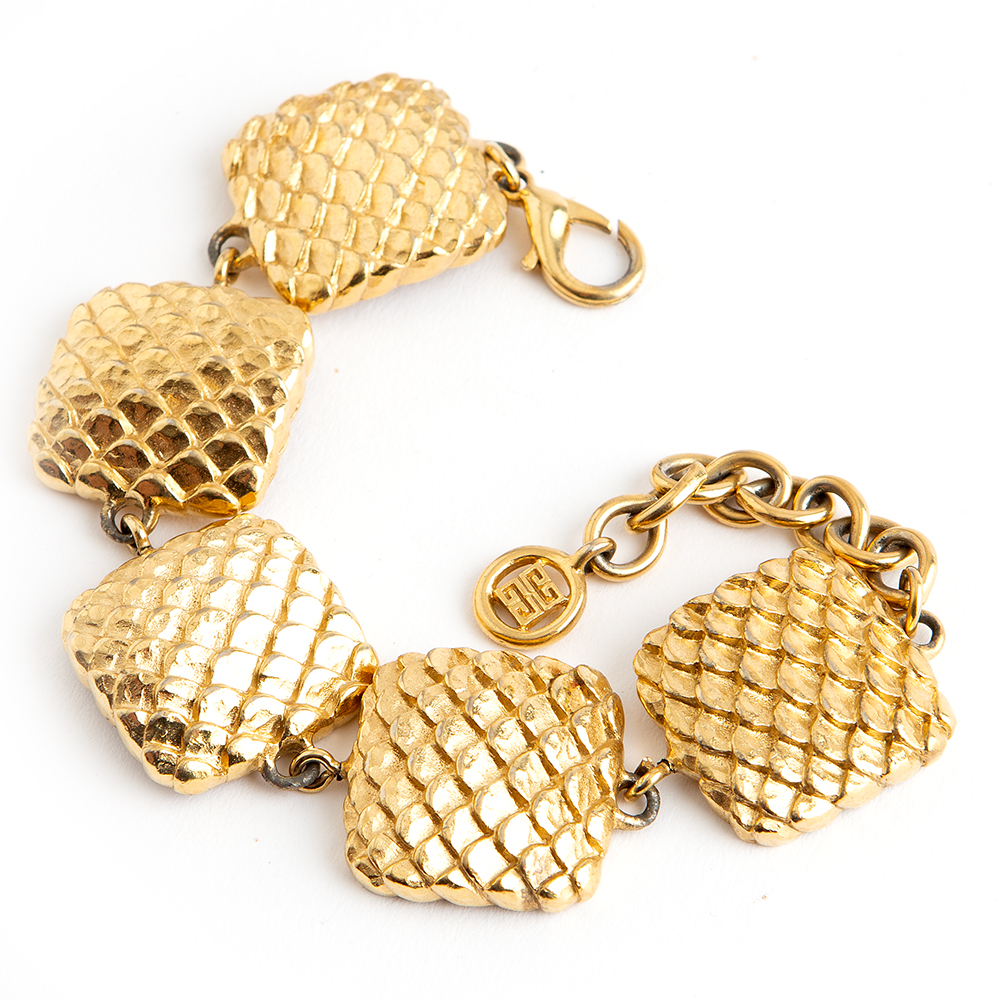 Vintage gold-tone metal bracelet from Givenchy 1980’s – 90’s Vintage featuring square decorative links and the Givenchy “4” trademark hanging from lobster clasp and inside bracelet.