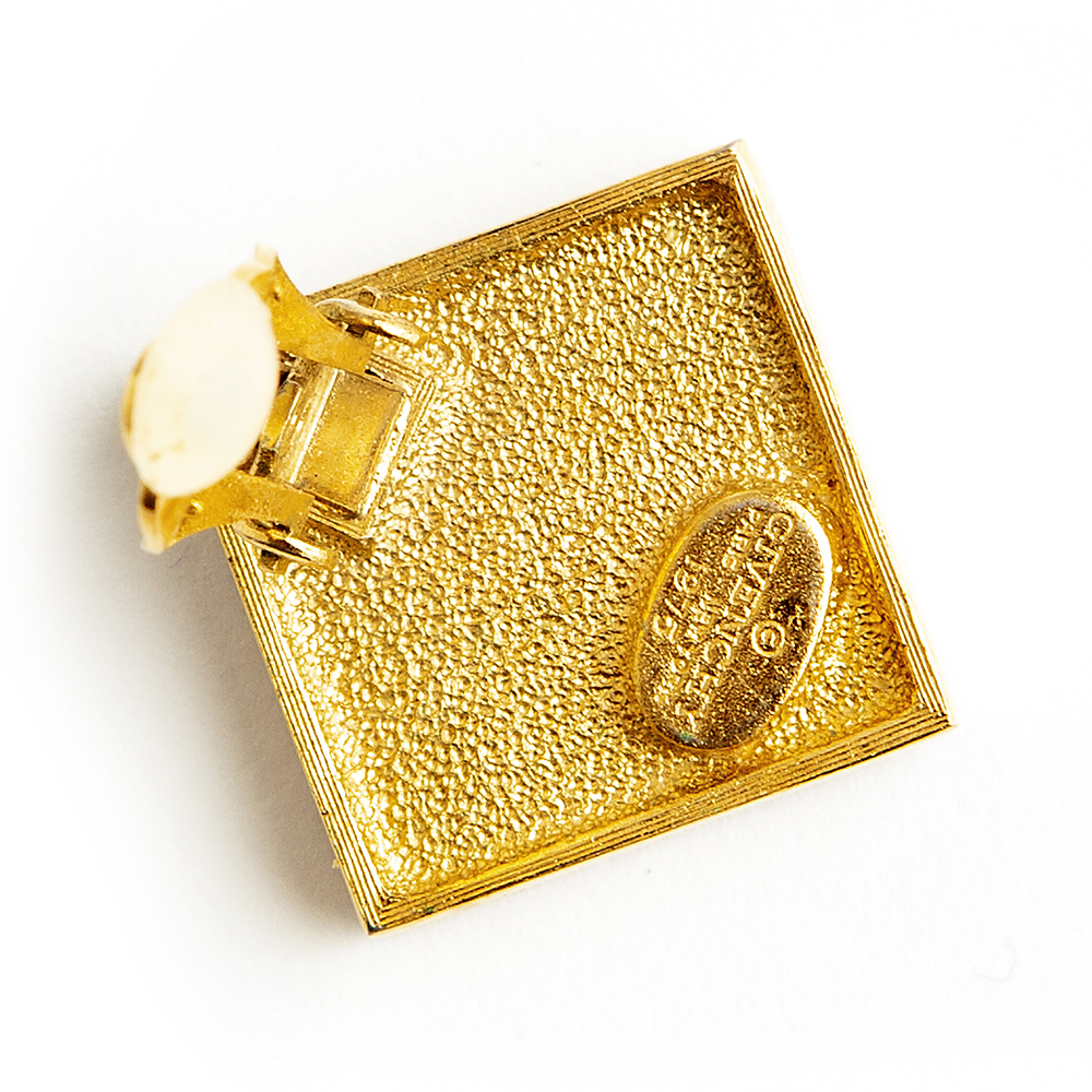 Vintage and authentic Givenchy dark green clip on in square solid plated gold and chrystals. Features a jovial design and an authenticity mark at the back of both earrings.