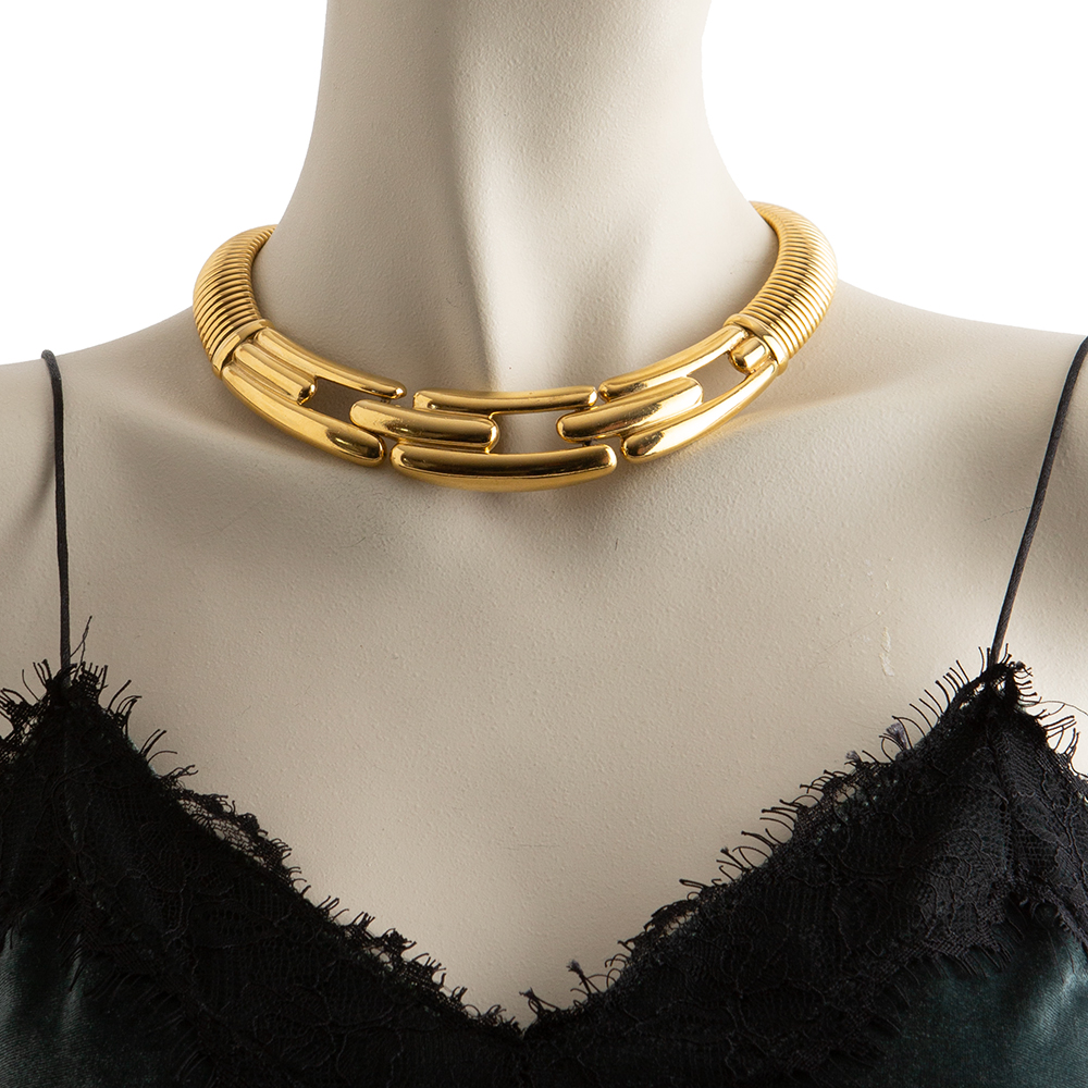 This vintage Givenchy necklace from the 80-90’s is a stunning piece of jewelry that is sure to make a statement. The design features a beautiful combination of yellow gold tone metal and a decorative center pattern creating a unique and eye-catching look. The necklace is signed by Givenchy, adding an extra touch of authenticity to this vintage piece.