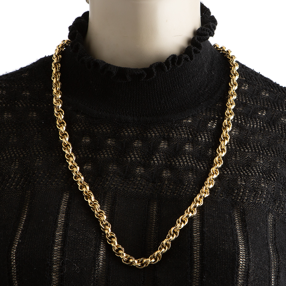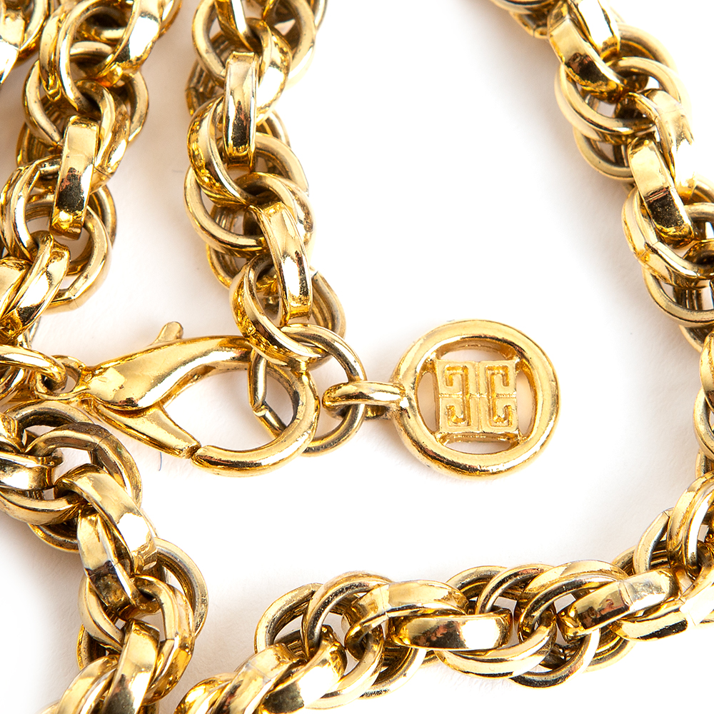 Vintage gold-tone metal chain necklace from Givenchy 1980’s – 1990’s. Vintage featuring intertwine links and the Givenchy “G” trademark metal detail hanging from lobster clasp.