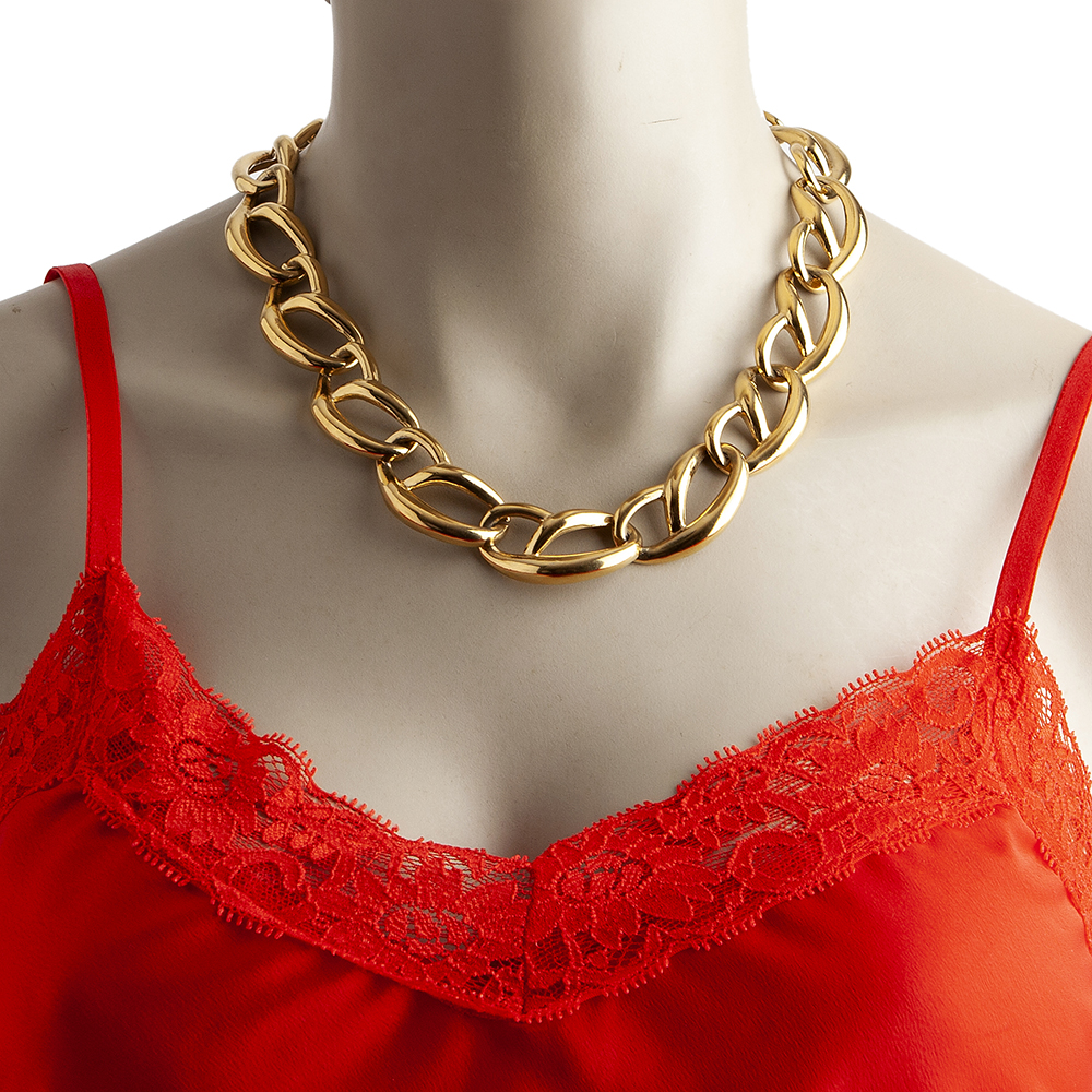 Mid weight piece of intricate high quality. Graduating chunky oval chain link necklace in rich gold plating.