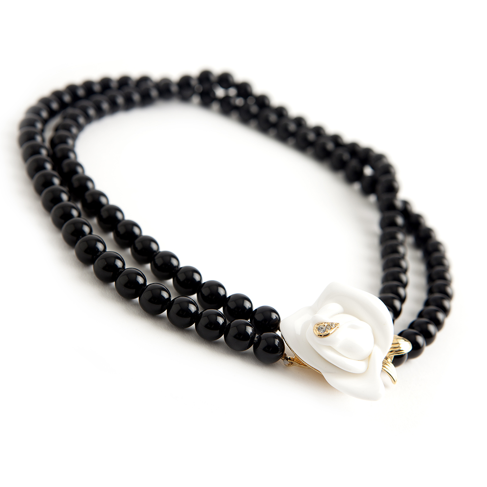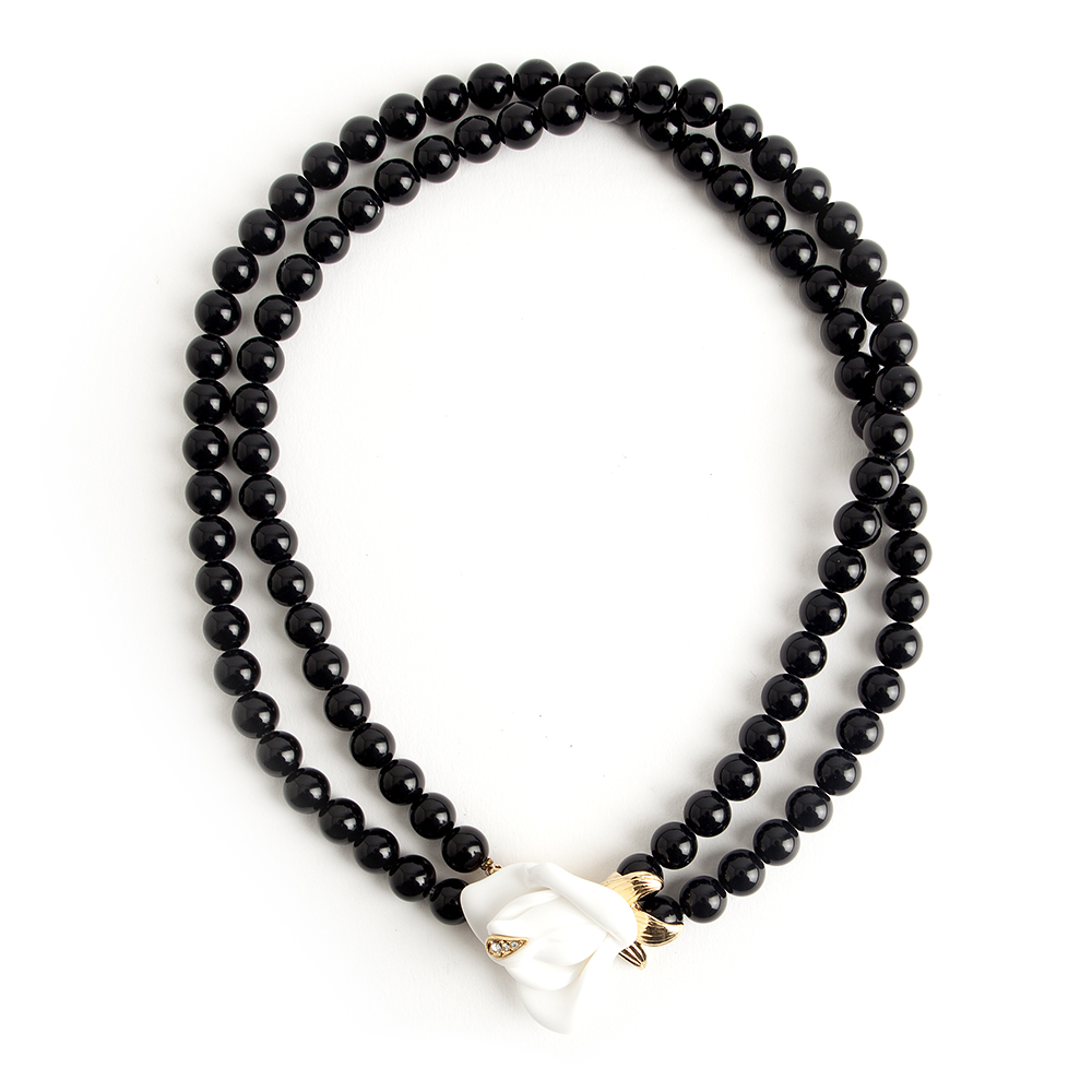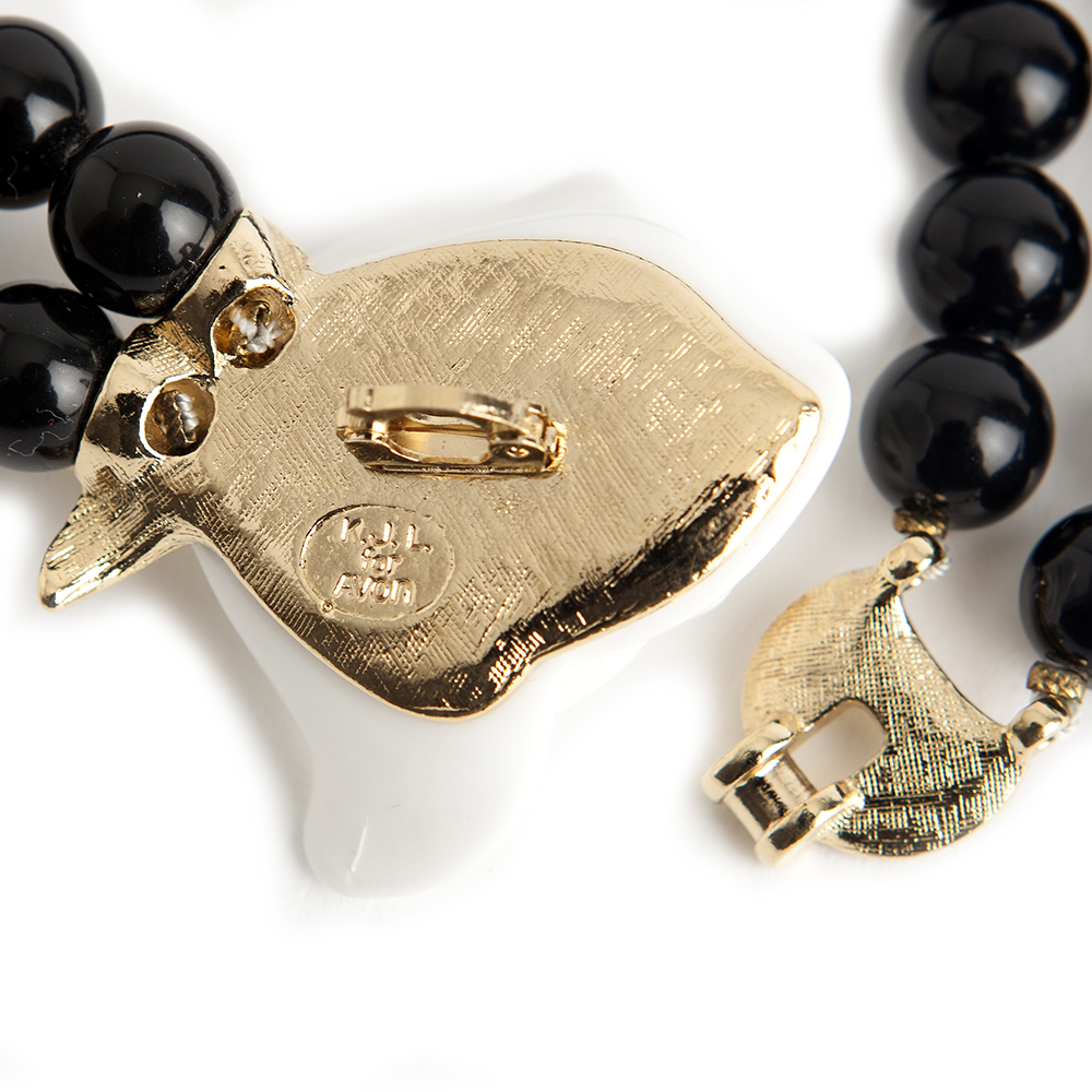 Vintage Kenneth Jay Lane for Avon costume jewelry necklace consisting of a black pearled necklace with a white flower fastening.