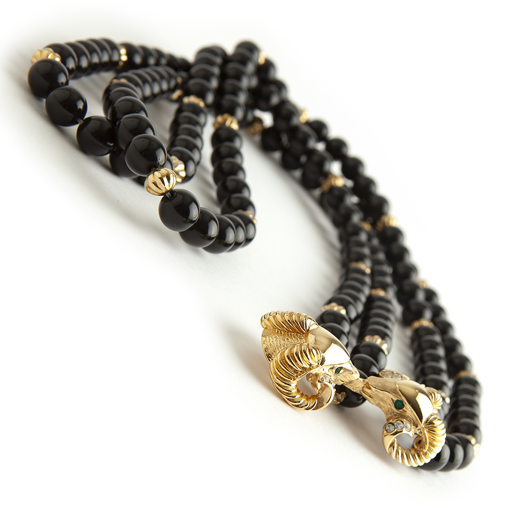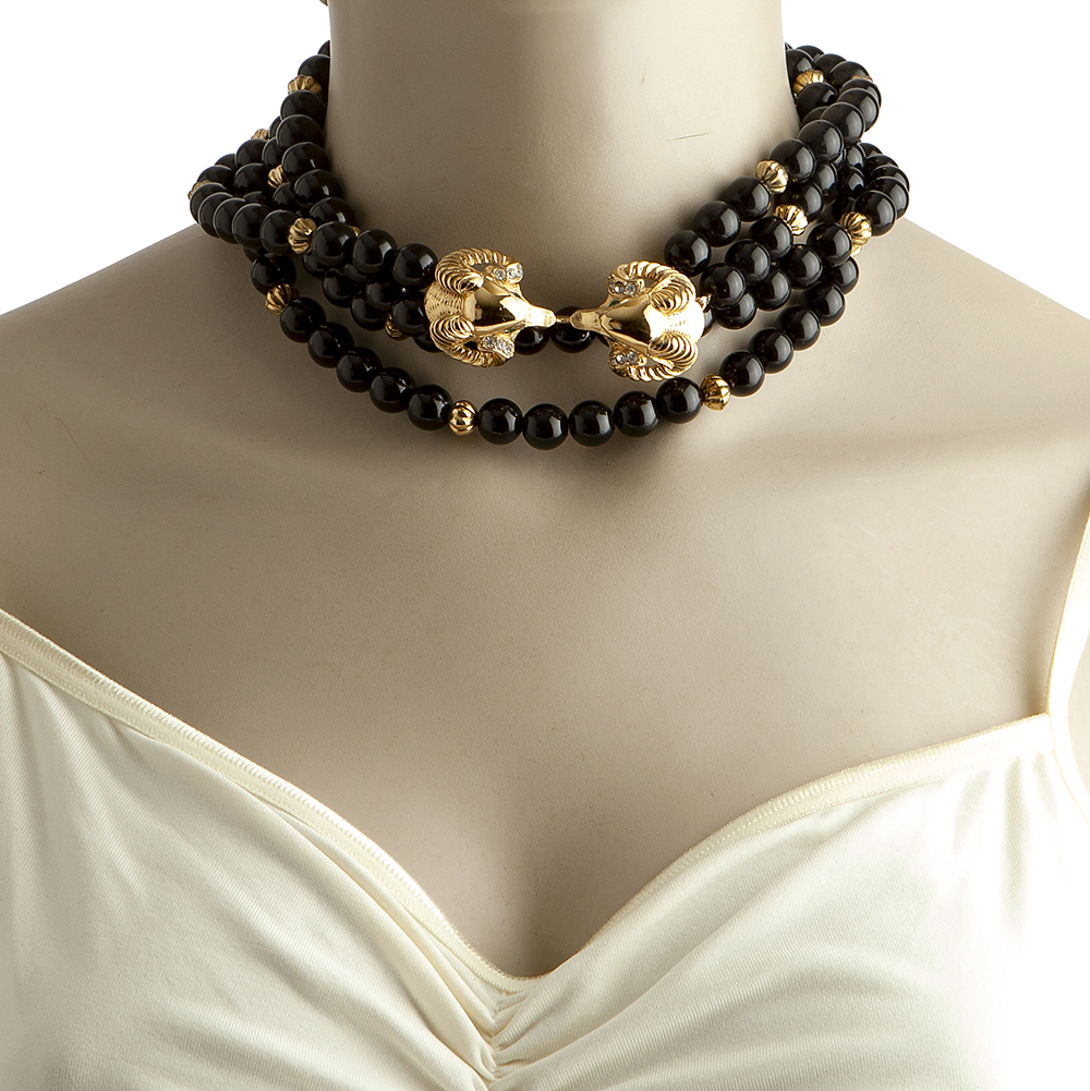 Vintage & Authentic Kenneth Jay Lane costume jewelry set consisting of a Black pearled necklace with two capricorn head fastening.