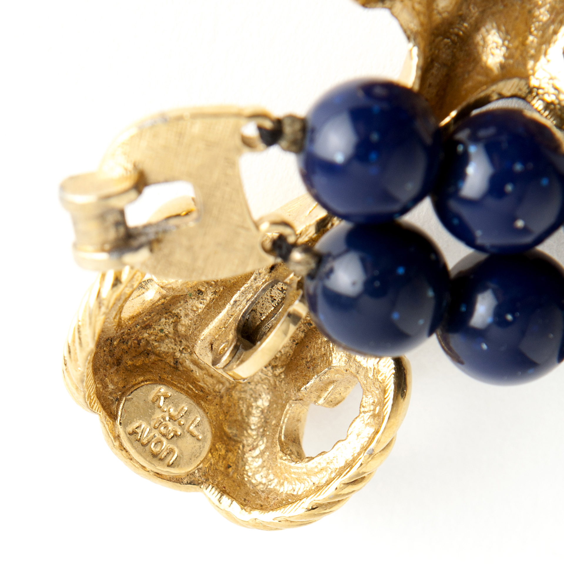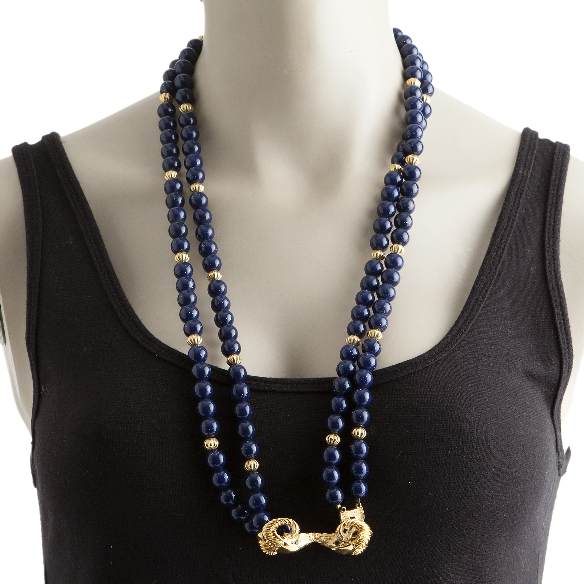 Vintage & Authentic Kenneth Jay Lane costume jewelry set consisting of a Dark blue pearled necklace with two capricorn head fastening.