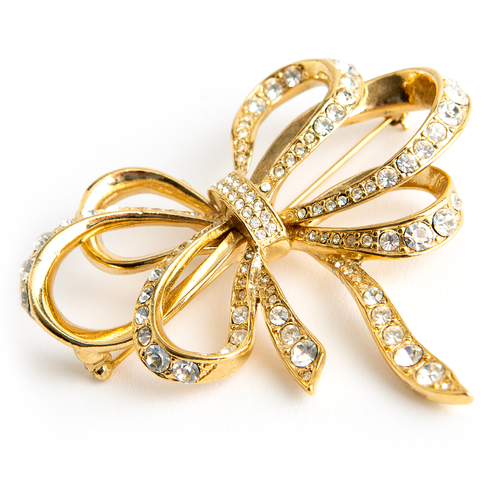 Gold tone and rhinestoned bow pin from the Kenneth Jay Lane house.