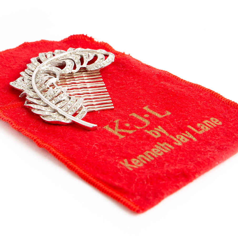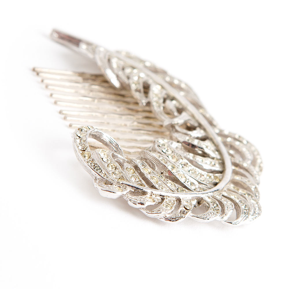 Fit for any feather lover, this amazing hair comb features a royal design in chrystal stones with silver tone base.