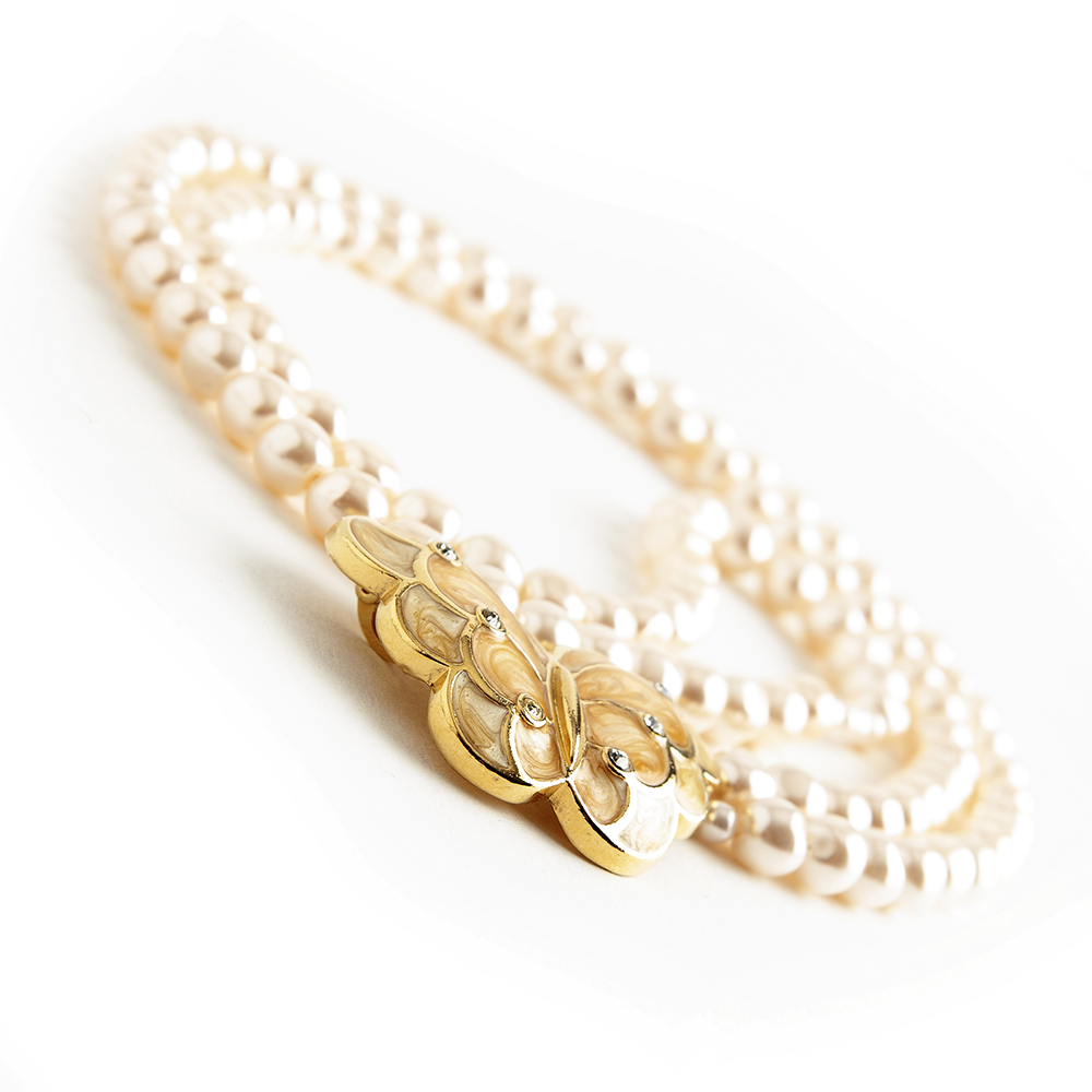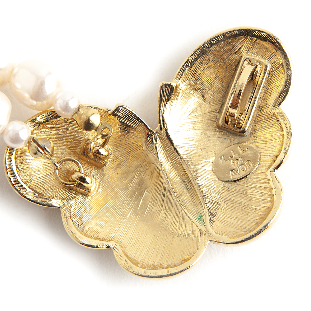 Vintage Kenneth Jay Lane costume necklace consisting of a faux pearled with a butterfly pendant in the shade peach.