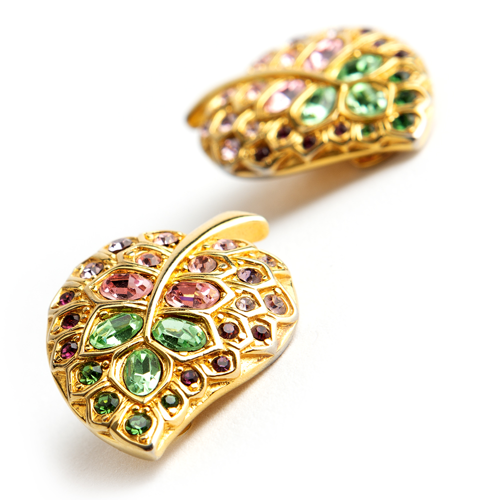 Kenneth Jay Lane leaf earclips. Authentic and vintage gold-tone and rhinestoned earrings; in shape of a leaf.
