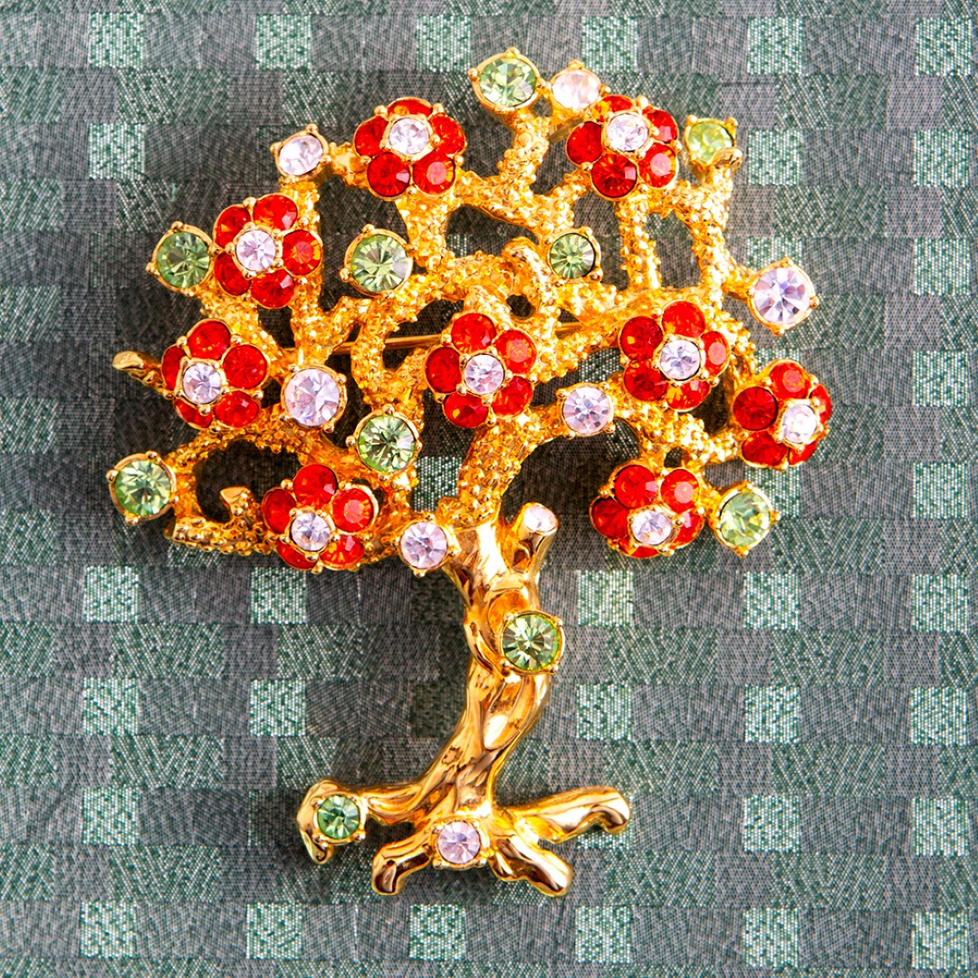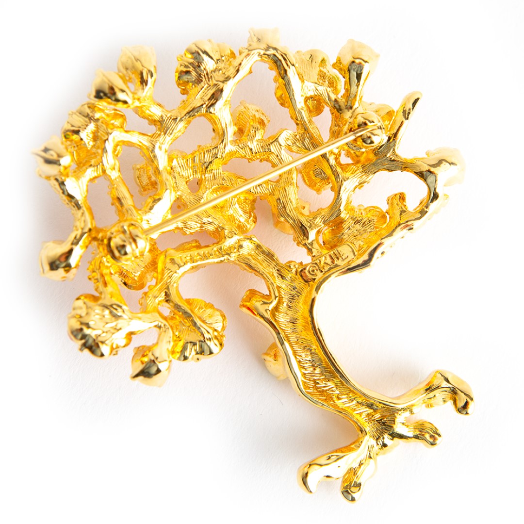 Fit for any tree and nature lover, this amazing tree brooch features a royal design in green/red chrystal glass stones and gold tone plating. Signed @ KJL (Kenneth Jay lane) at the back.