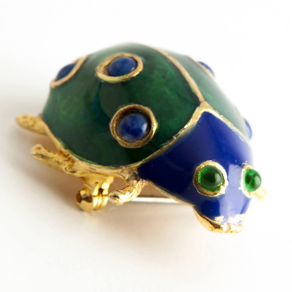 Fit for any insect lover, this amazing ladybug brooch features a jovial design in green and blue. Signed Kenneth Jay lane.