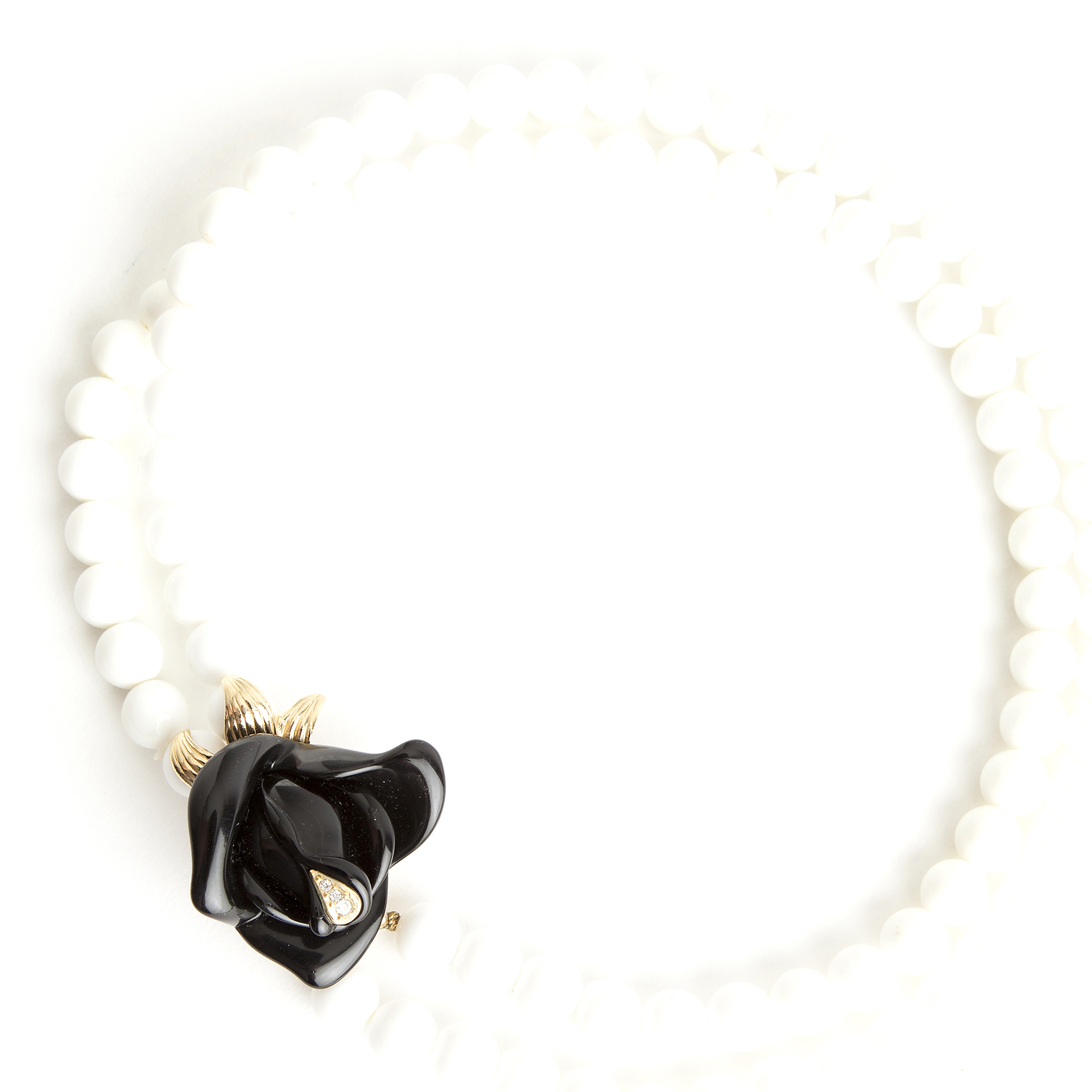 Vintage & Authentic Kenneth Jay Lane costume jewelry set consisting of a White pearled bead necklace with a Black flower fastening.